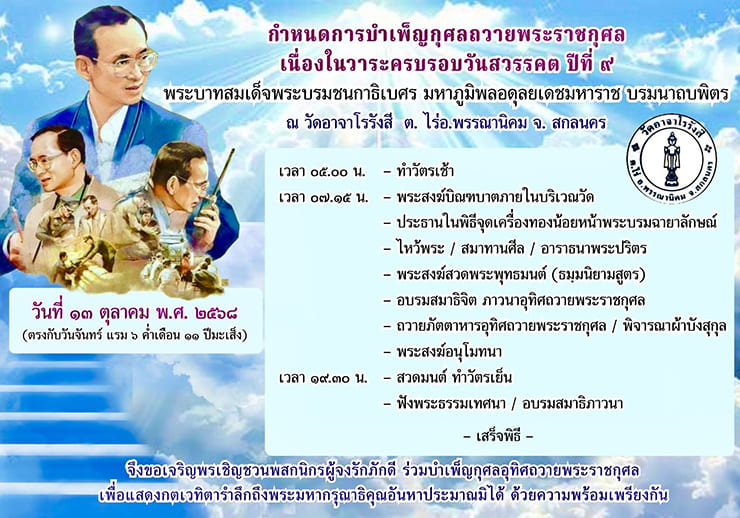 พิธีบำเพ็ญกุศลอุทิศถวายพระราชกุศล วันพุธที่ ๑๓ ตุลาคม ๒๕๖๔ ขึ้น ๗ ค่ำ เดือน ๑๑ ปีฉลู เนื่องในวาระครบรอบวันสวรรคต ปีที่ ๕ พระบาทสมเด็จพระบรมชนกาธิเบศร มหาภูมิพลอดุลยเดชมหาราช บรมนาถบพิตร วัดอาจาโรรังสีจัดพิธีบำเพ็ญกุศลอุทิศถวายพระราชกุศล ช่วงเช้าคณะพระสงฆ์ออกบิณฑบาตในบริเวณวัด เจริญพระพุทธมนต์ อบรมสมาธิ ถวายภัตตาหารเช้า และบังสุกุลอุทิศถวายเป็นพระราชกุศล