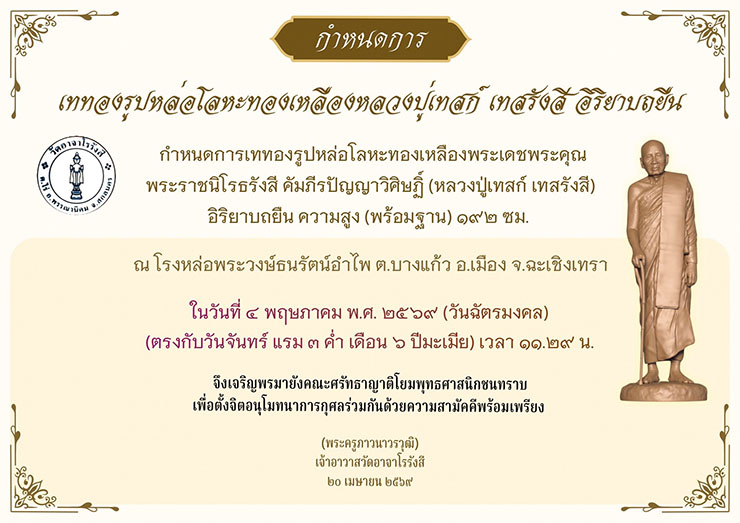 กำหนดเททองในวันที่ ๔ พฤษภาคม พ.ศ.๒๕๖๙ (ตรงกับวันฉัตรมงคล วันจันทร์ แรม ๓ ค่ำ เดือน ๖ ปีมะเมีย) แล้วเสร็จภายในวันที่ ๔ มิถุนายน พ.ศ.๒๕๖๙ จากนั้นส่งไปทำสีที่โรงงานในจังหวัดนครสวรรค์ (ตามคำแนะนำของหลวงพ่ออินทร์ถวาย) เรียบร้อยแล้วจึงอัญเชิญหลวงปู่ไปประดิษฐาน ณ เจดีย์ฯ วัดป่านาคำน้อย